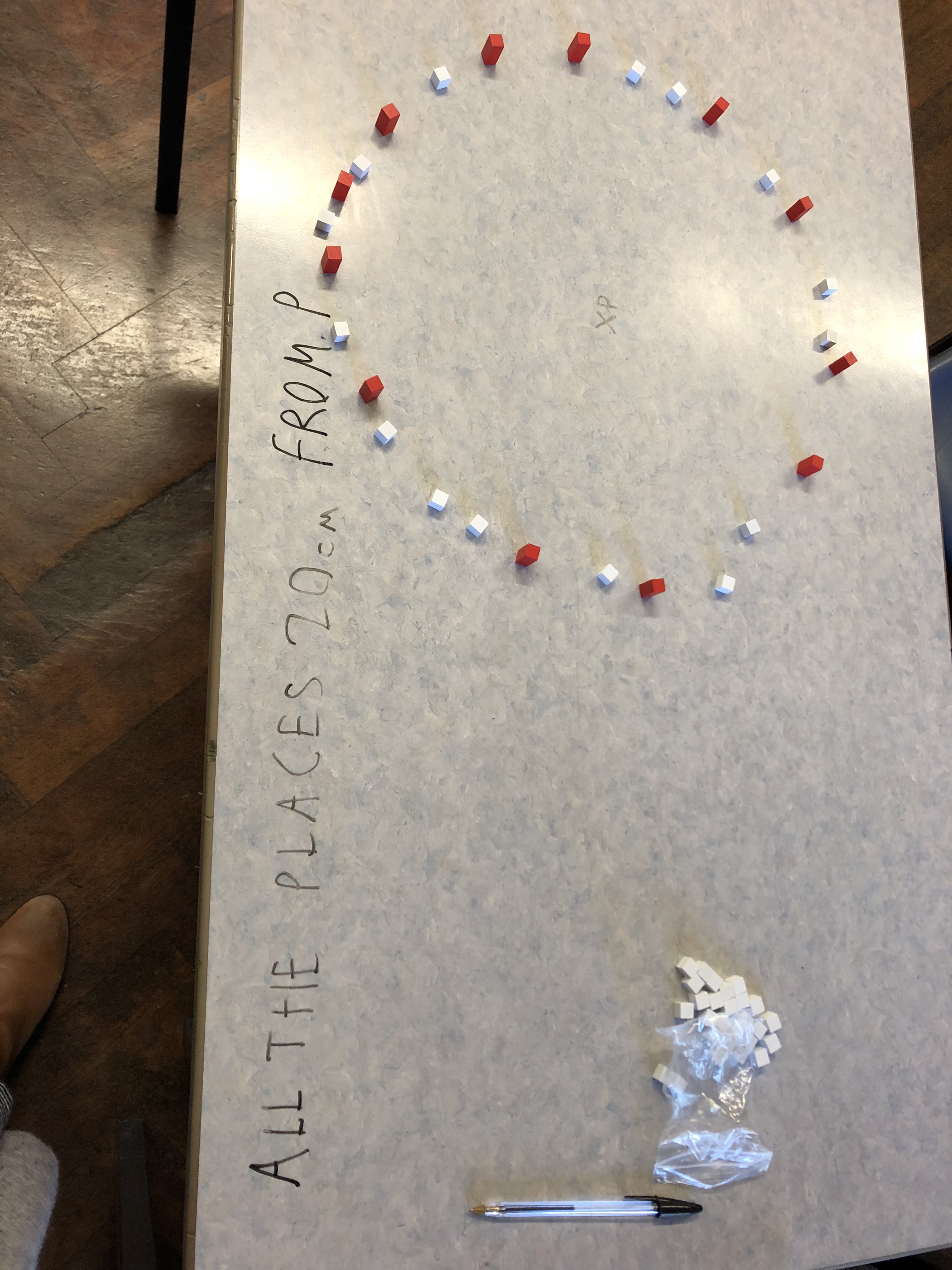 I saw lots of students, ruler in hand measuring the points, some drew lines, like radii in the first problem and i asked them what they would do if i had drawn loads of points on the page, say 100. A few students noticed the circular shape to the points identified and i think if i had drawn loads more points this might have been a little clearer to the students. This activity did help students when they had no idea of what the loci of points might look like. Later in the lesson students were seen locating points to help them see what shape the loci was creating.