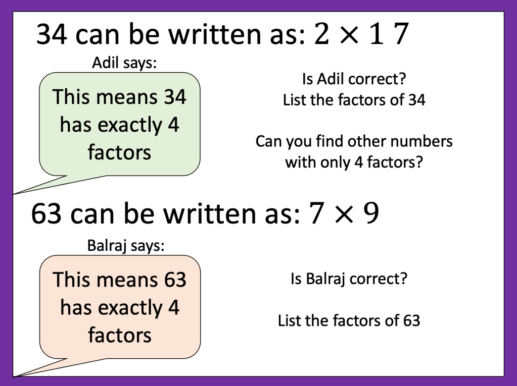 I was thinking about the factors particular numbers and considered how many factors int he numbers from 1-40. When I reached the 30s I was surprised how many numbers could be written as a product of two primes, meaning they have 4 factors in total. So I started wondering about what students would make of it. Would they realise if the number was written as a product of two primes it would have 4 factors and would they realise you could easily find a number with 4 factors by multiplying 2 primes together.