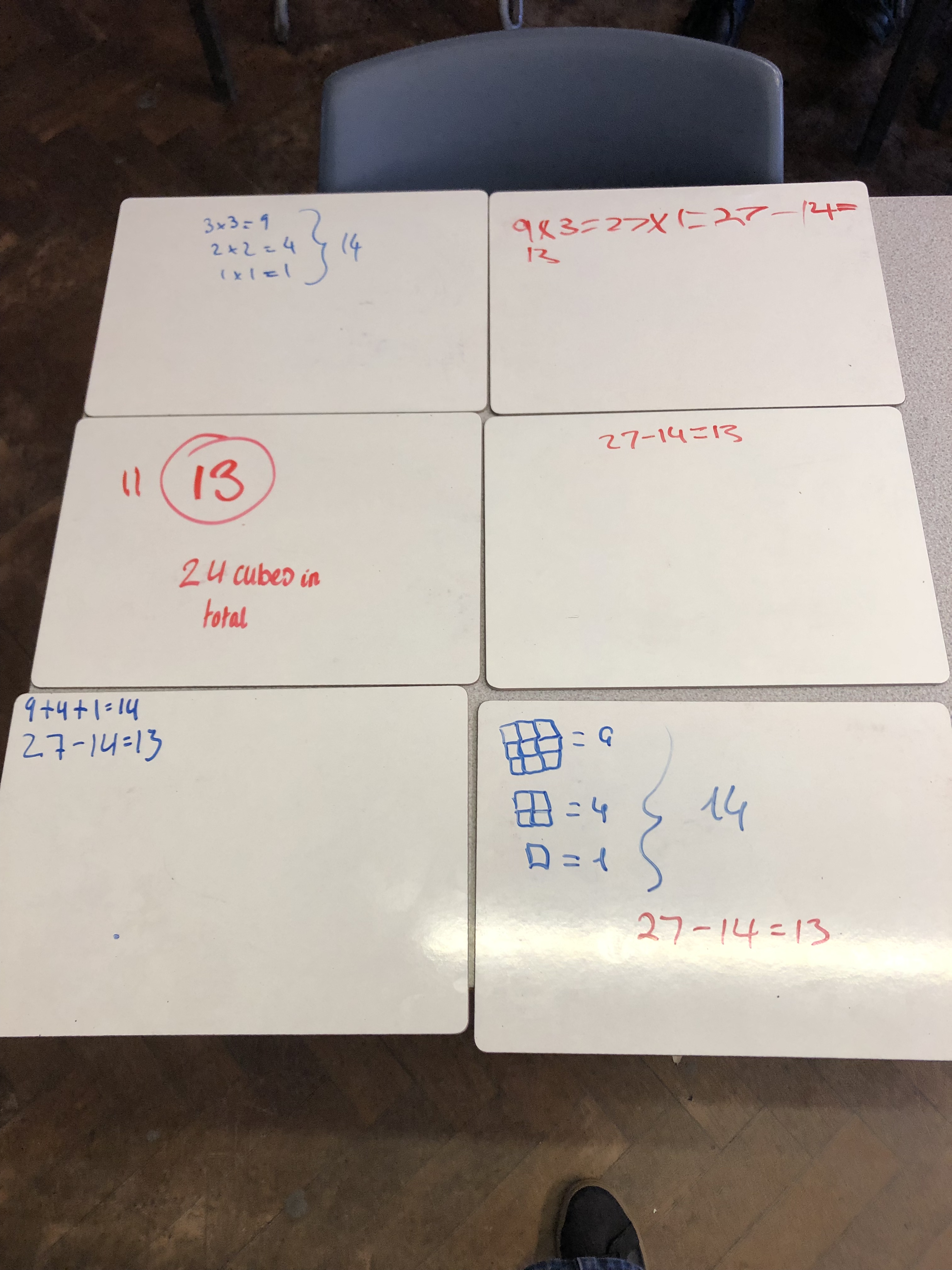 I gave a class this task and it was interesting to see how they used the idea of layers to help them answer it. A few students used 27 minus the cubes they could see but a number of students ‘filled’ in the missing cubes to make the 3cm cube. My thanks to Prof Smudge (Maths medicine) for this task.