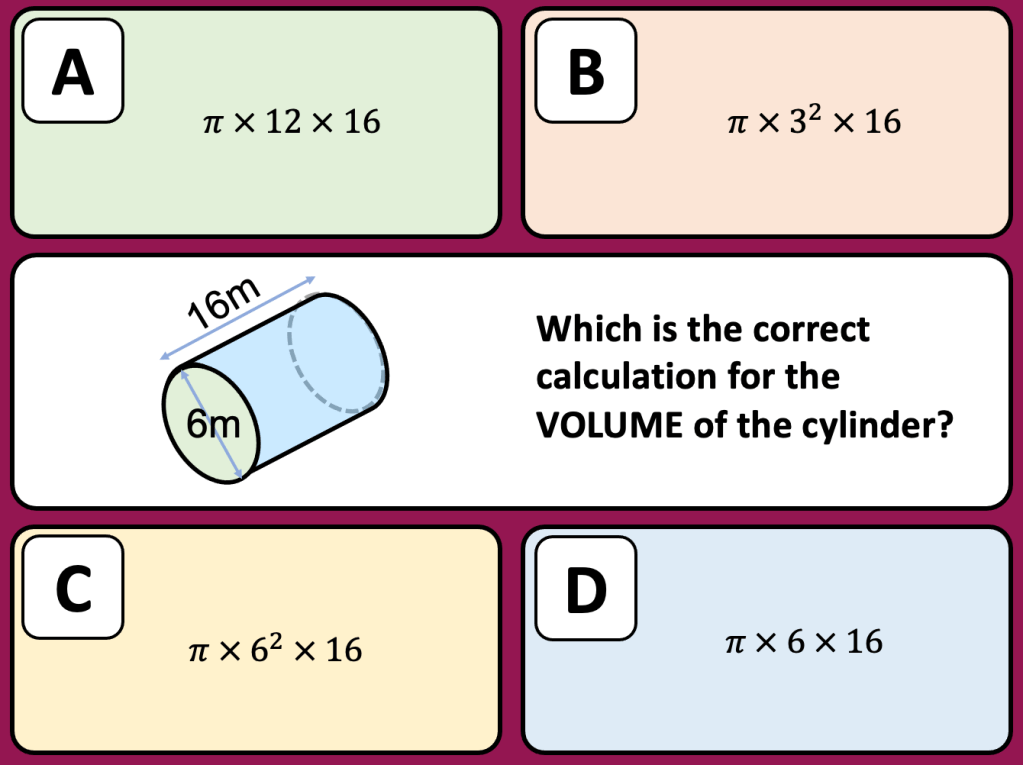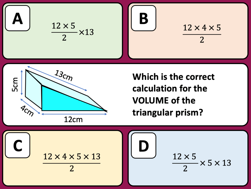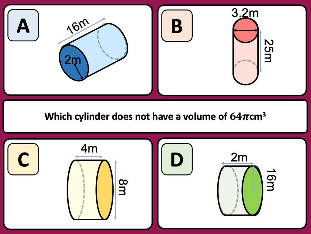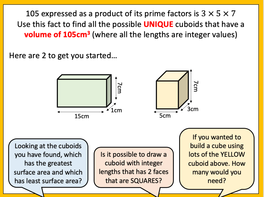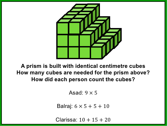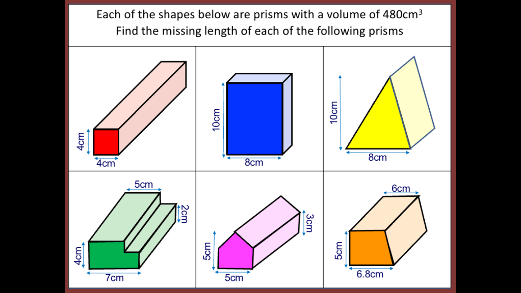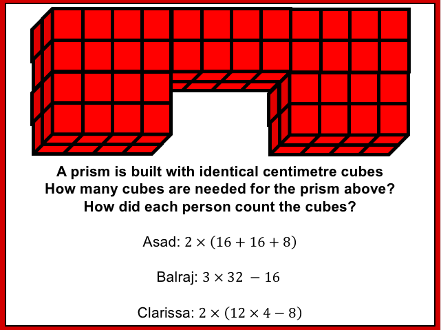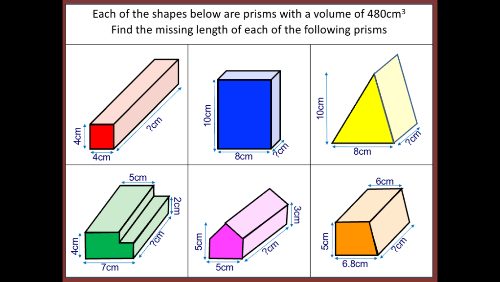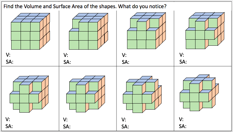 This week I was tasked with teaching Volume to year 10 and I thought that this would be a fairly straight forward lesson. I decided to start with a starter whereby I told the class I had 24 cubes and I wanted to arrange them into a cuboid (using all the cubes) I gave them some time to discuss this problem. Some students took to drawing cubes in their books, others sat looking blankly so when one student pointed out that I had a box of unifix cubes in the room and could he use some. I allowed the students to use the cubes to help them with the problem. One girl built a cube with dimensions 2x3x4 but the rest made frames without cubes inside or were unsure how wide to make the cubes. They didn’t seem comfortable putting cubes together and seeing how it went. We looked at the cuboid that was made and worked out what the dimensions were. I tipped the cuboid over and asked them what the dimensions were. It took a few moments for someone to recognise it was the same numbers;2,3,4. I asked the students how many cubes there were in the cuboid (which was now on its side) and I was surprised to see some students counting cubes. One student shared that she thought we were looking at Volume (which was displayed as the title) and so you work this out by doing length x width x height so it was 2 x 3 x 4. After a pause the answer was given; 24. I assumed that they would know that as i hadn’t removed or added a cube that the volume would stay the same. For some the idea of conservation was still not concrete in their minds and it seemed the commutative law wasn’t either.