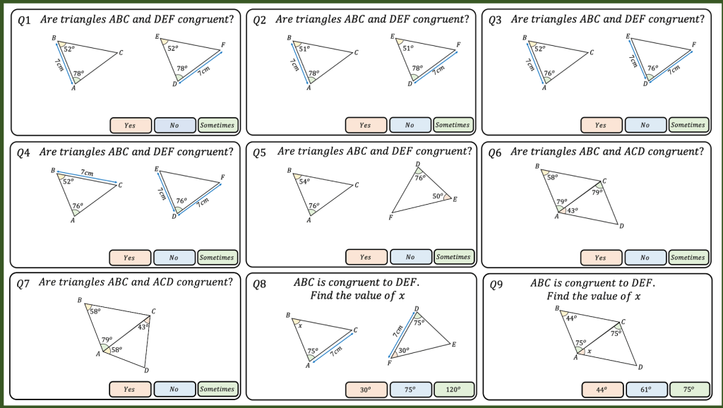 Standard Posted by Miss Konstantine Posted on November 14, 2018 Posted under Uncategorized Comments Leave a comment Congruency I have been working on angles questions with my year 11s and they always struggle with recognising which angles are the equal angles in an isosceles triangle. They also forget what congruent means so i gave them this question today. congruenceDownload Share this: Share on X (Opens in new window) X Share on Facebook (Opens in new window) Facebook Like Loading...