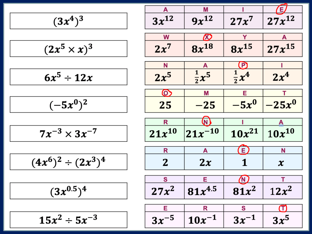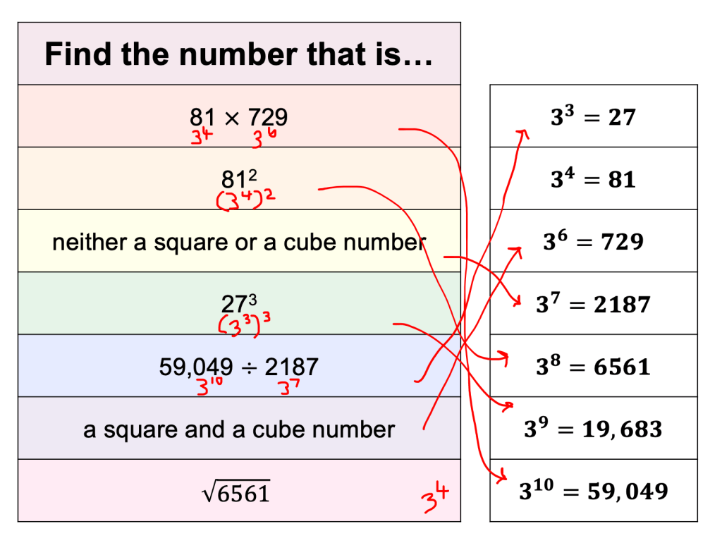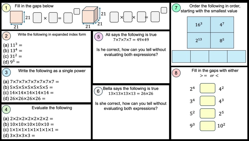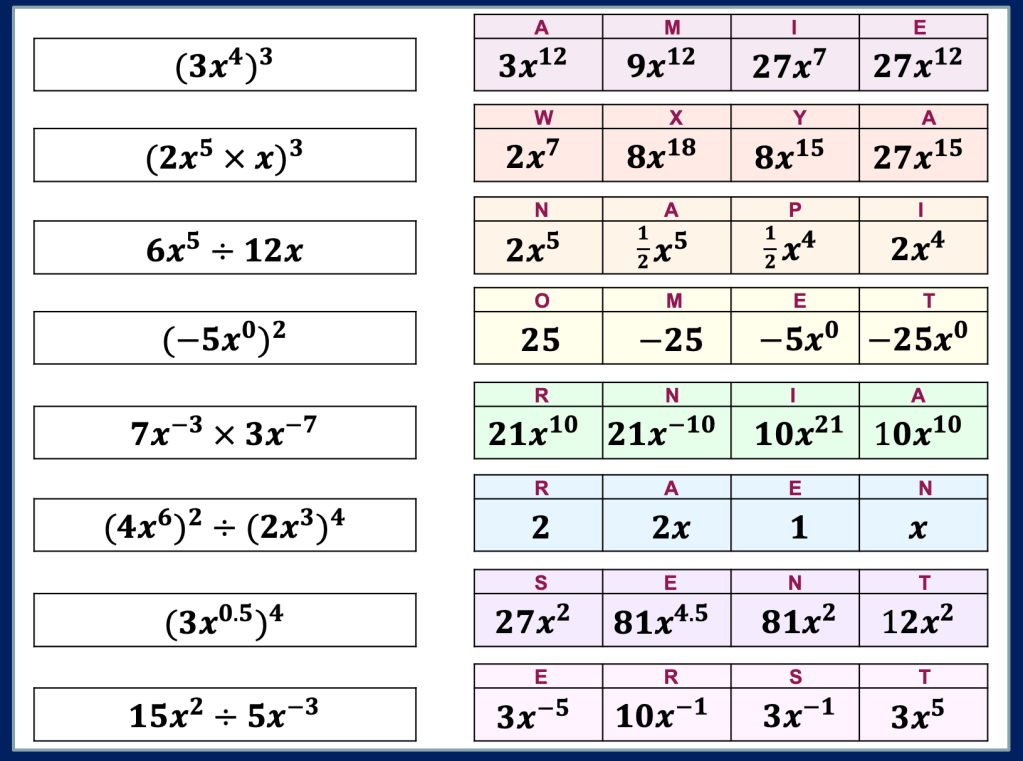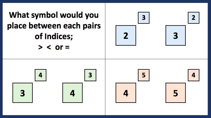 Update: I am fortunate enough to work with some great trainee teachers who are constantly striving to improve their practice in Maths. In a lesson today I was privileged to watch a teacher work on Indices with a year 10 class and below is a product from the discussion we had on Indices during and after the lesson.
