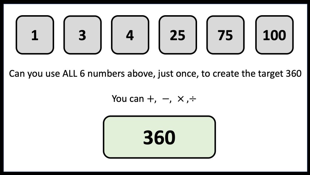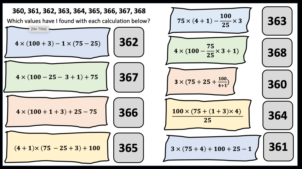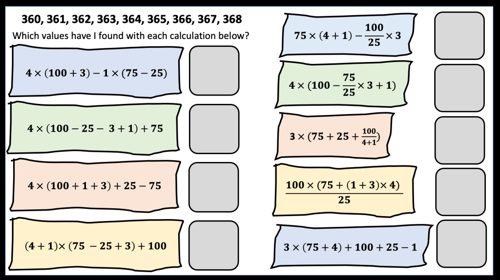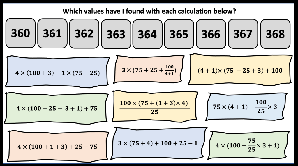 I have used an ‘insert the brackets’ type question before but find students can sometimes just wait for the answer to just jump out at them rather than trying to fit in brackets to make the answer work (even if its on a trial an error basis). I like using the same expression so students are more inclined to try a few ideas. After using a similar question to the one below, one of my year 7 class said he had found some answers that weren’t in the cloud so i thought it might be nicer to give them an expression and ask them to find as many different answers as they could by inserting brackets.