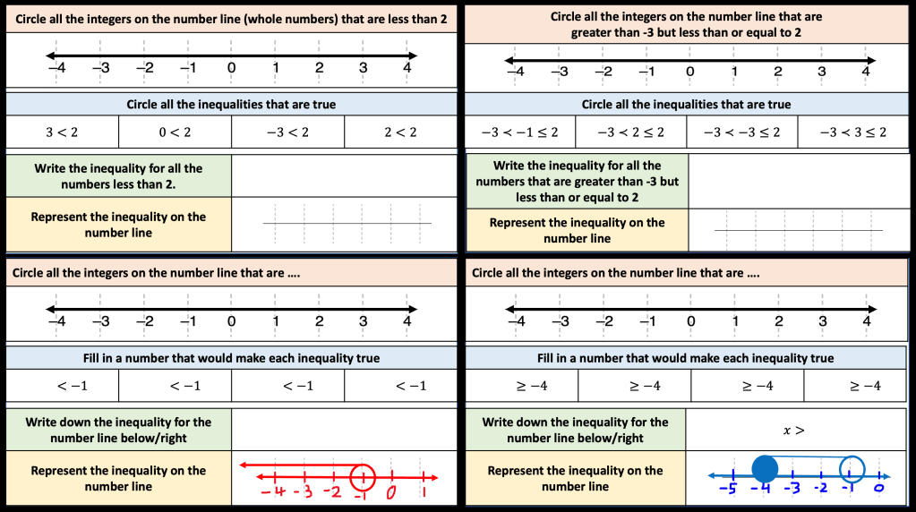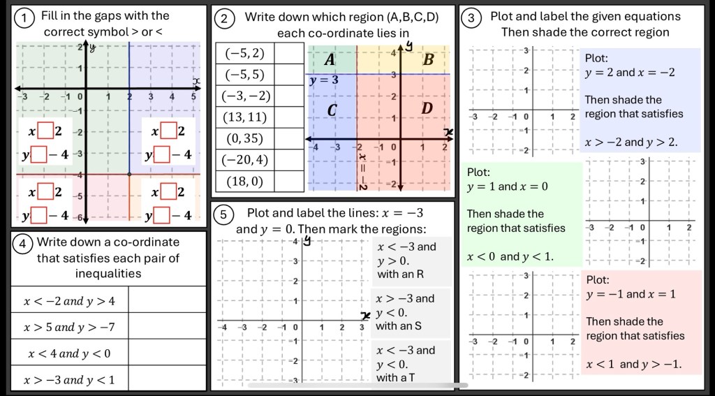 I have been looking ahead at some topics I will be teaching in the first term and one of those is inequalities. I wanted to look at some activities where students could identify shaded regions. I thought one activity could be to identify correct inequalities when the co-ordinates were substituted. Then once co-ordinates were identified as lying in a region I thought that then next step was to use this to find the correct inequality.