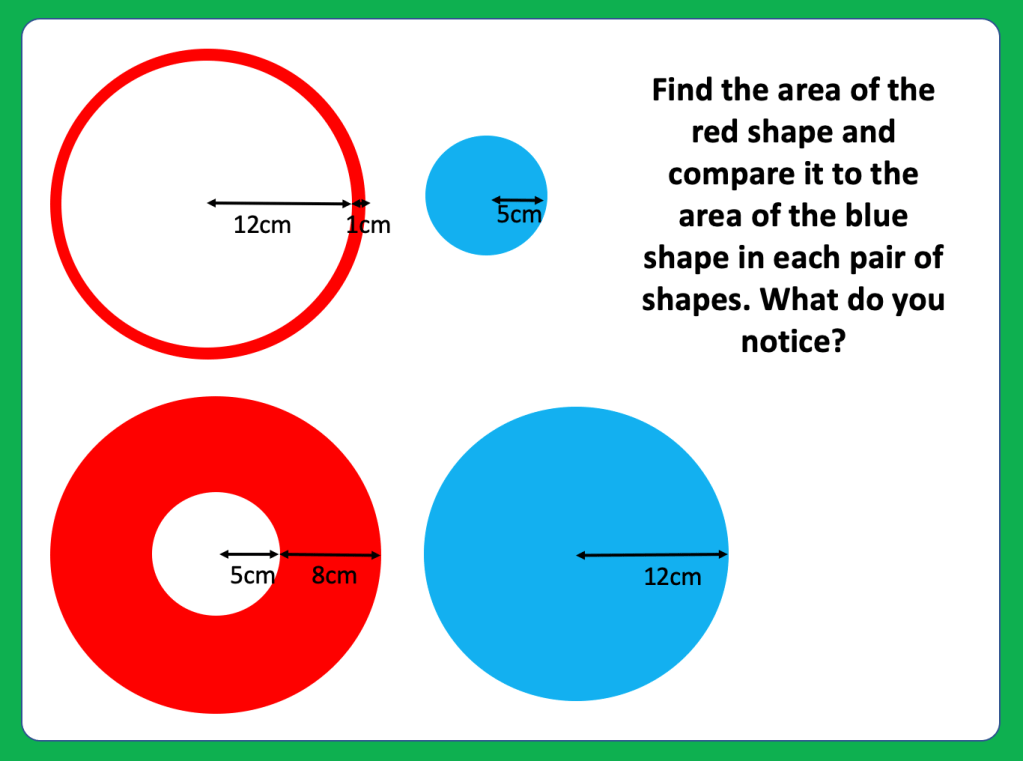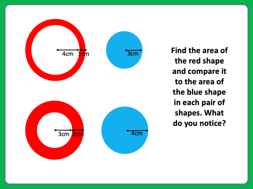 I have been looking at Pythagoras with year 11 and also looking at Pythagoras in context questions. When we looked at question with a Pythagorean triple, I drew an square with length 5cm with a square of length 4cm cut away, next to it I drew a square with length 3cm. We discussed why the two shapes equalled. This left me thinking about other shapes with equal areas.