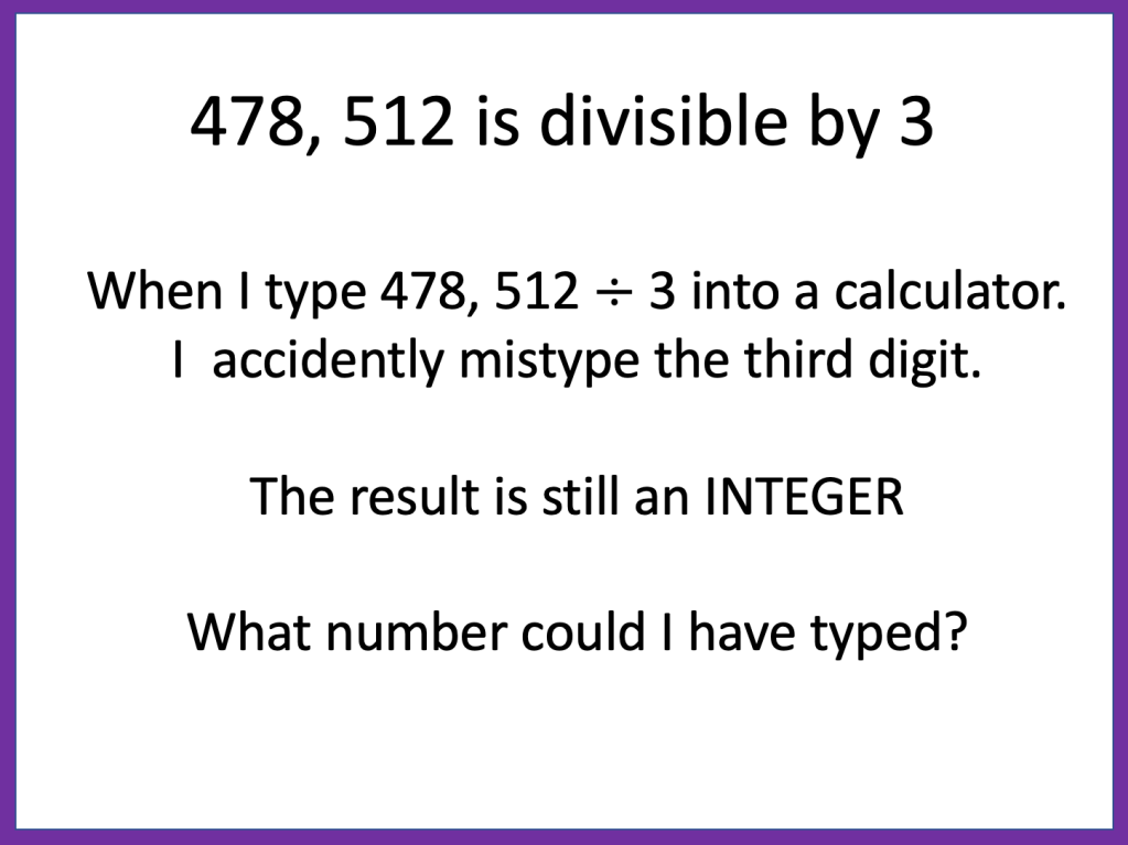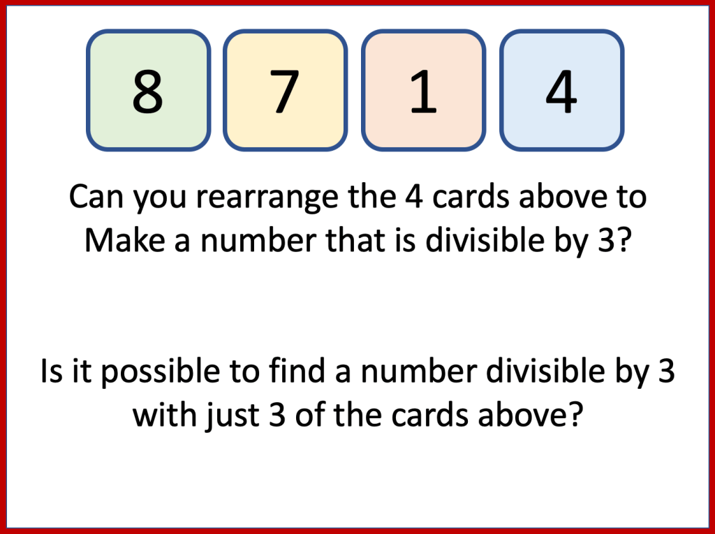 At the end of the game, we counted our cards and I said to one person “you have miscounted” They looked puzzled but checked and was surprised to learn that I was correct. I thought it would make an interesting question in class. I changed the original numbers. I then thought it might make a good starting point for a discussion on divisibility of 3. I then started thinking of other questions that relied on the divisibility of 3.