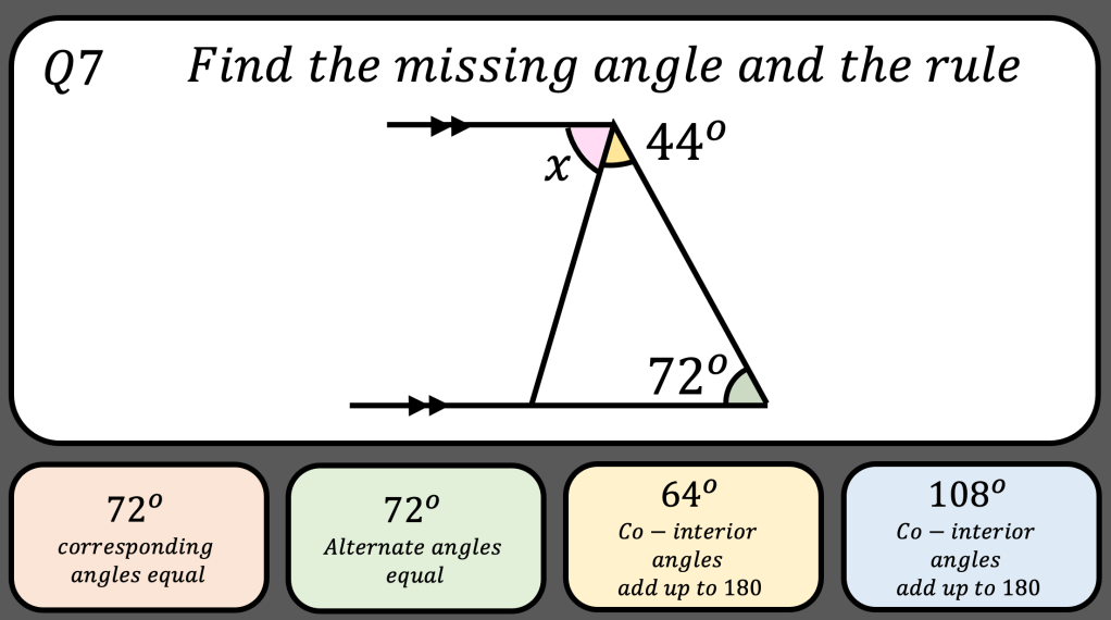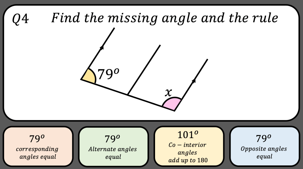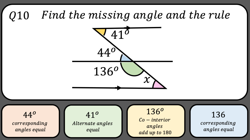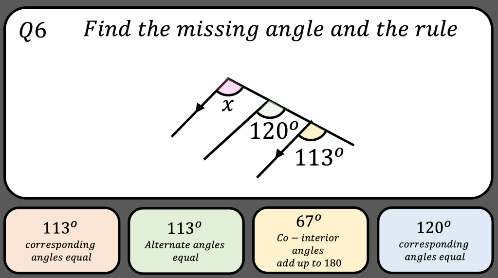 After I introduce angles in parallel lines to my class and discuss the correct reasoning. I want to show them lots of different examples and non examples so they are confident in recognising alternate, co-interior, corresponding and opposite angles, whilst still noticing basic angle facts.