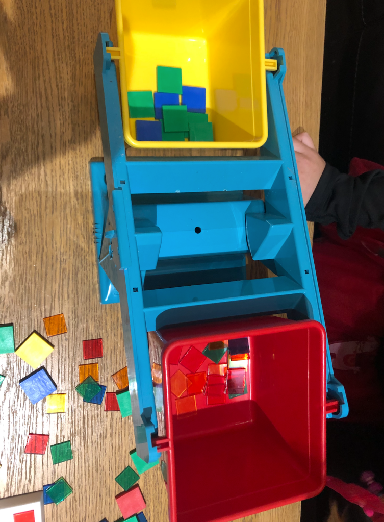 After a while, she pulled out the scales that we’d discovered earlier in the day (we’d done some tidying of her toys and found the scales) She played with these for a while, adding tiles in each side and watching them tip one way or balance. After she had dumped out both buckets, I put 10 large wooden tiles into one of the buckets. I asked her how many plastic tiles would weigh the same. I gave her the other bucket and she started to fill it. She counted up in twos and said; “I think it’s 20,” before replacing the bucket on the other end of the weighing scale. The balance tipped in the wooden blocks favour, so she said she would add more plastic tiles in. She counted out 30 more and realised it was 50. I pulled out all the wooden tiles, except for one and asked her to take how many tiles she thought would make it balance. She left the bucket on the scale and eventually she was satisfied the two buckets were equal when she had just 5 plastic tiles left. I threw in one more tile and she said; “ah that’s easy! Its 5 more plastic tiles” so I threw in another and she did the same. She then said; “lets do more” she then threw in wooden tiles so there was a total of 25 tiles in. She said; “I can work this out” she counted on her fingers in 5’s and stopped at 125. She then threw 125 plastic tiles into the opposing bucket but it tipped ever so slightly to the plastic tiles. She recounted and it was the correct amount so we discussed the fact that one wooden tile might be a little less than 5 tiles.