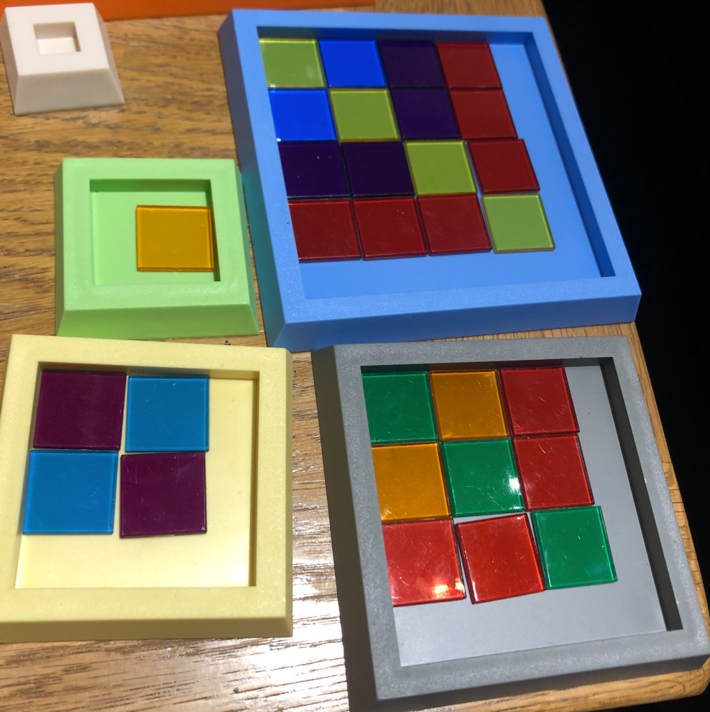 This afternoon, I tipped out the plastic 2.5cm tiles and the larger wooden tiles and got out the plastic trays. I started with the wooden tiles because I wanted to design a pattern to make for a “colour the pattern” task and my daughter played with the plastic tiles. She likes to arrange images in each of the differently sized Numicon trays and then stack the trays and ask me to “open the surprise” Today was no different and once I had unstacked the pile and looked, I saw a nice little pattern. She explained that she did the little tray first and then added a row each time she used a bigger tray.