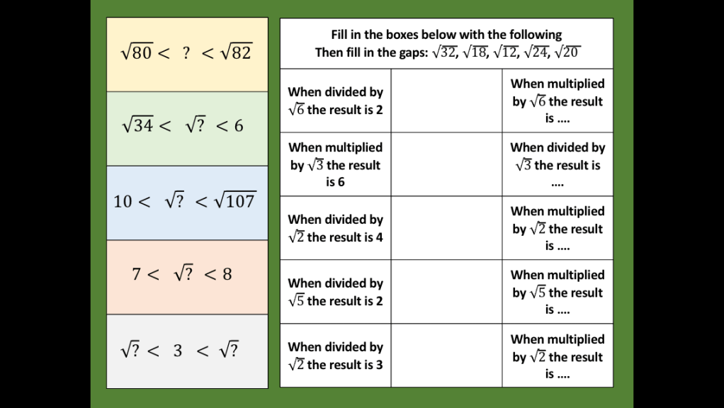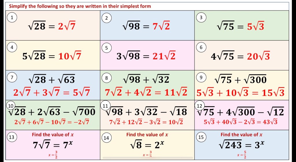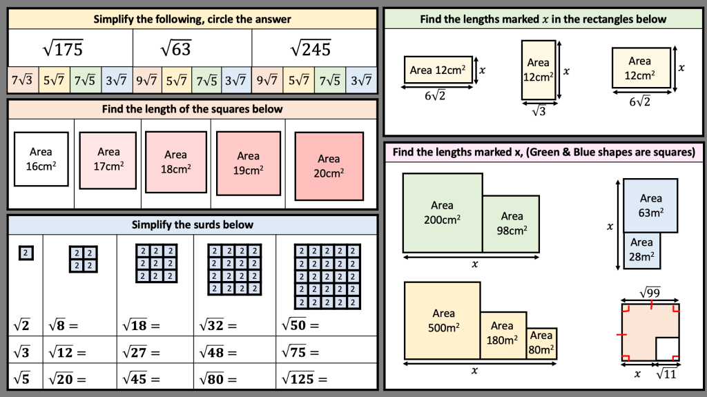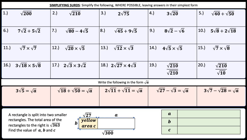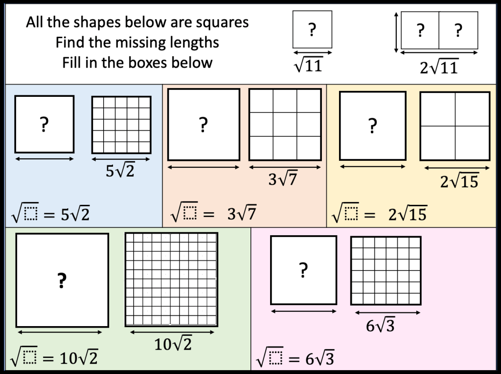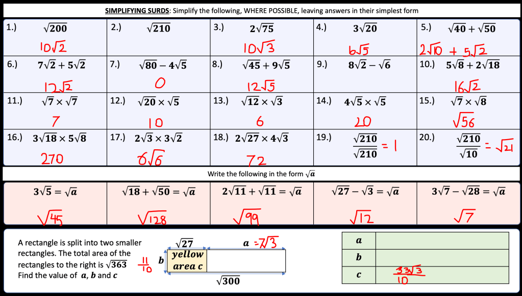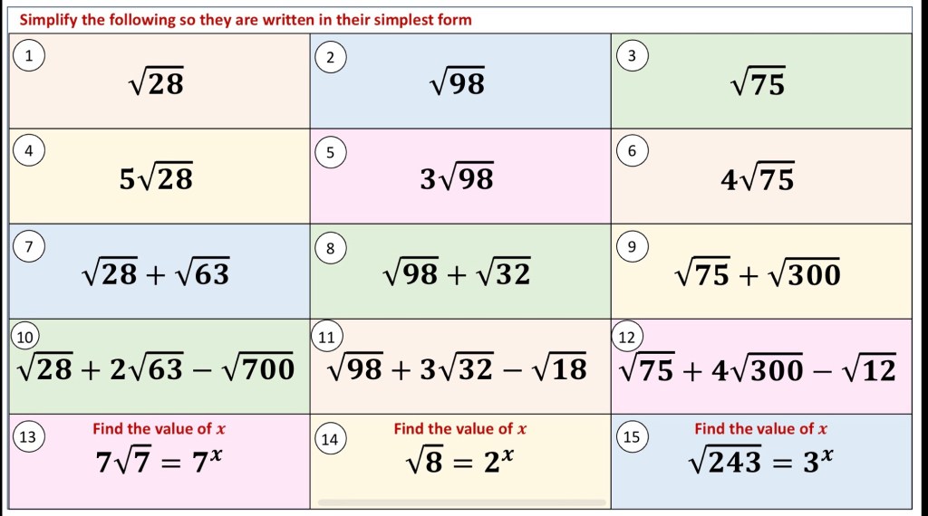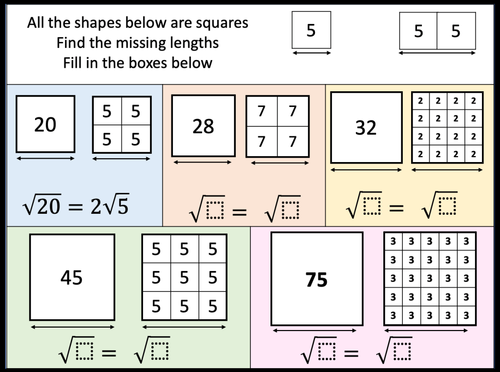 I have also been trying to connect surds and prime factor decomposition. Especially since we’re looking for square number factors that are easily identified once the number is in prime factor form.
