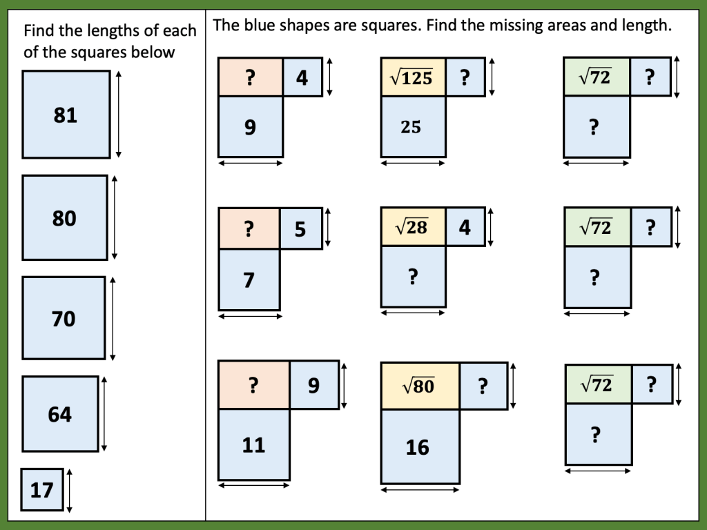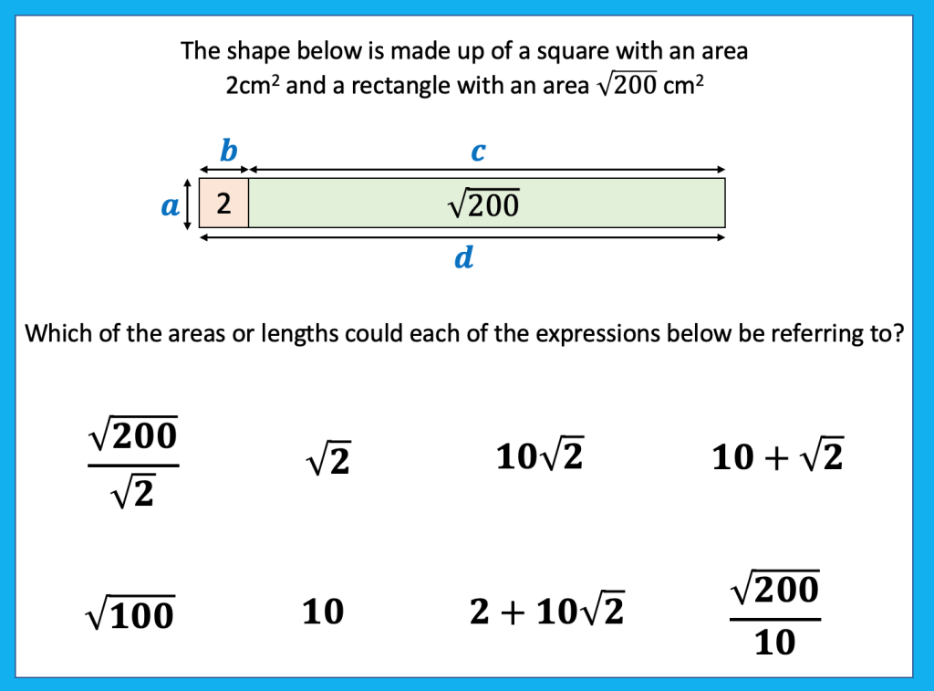 I have been thinking about some further connections between area and surds. I started this thinking a few years back after a discussion with https://twitter.com/Arithmaticks