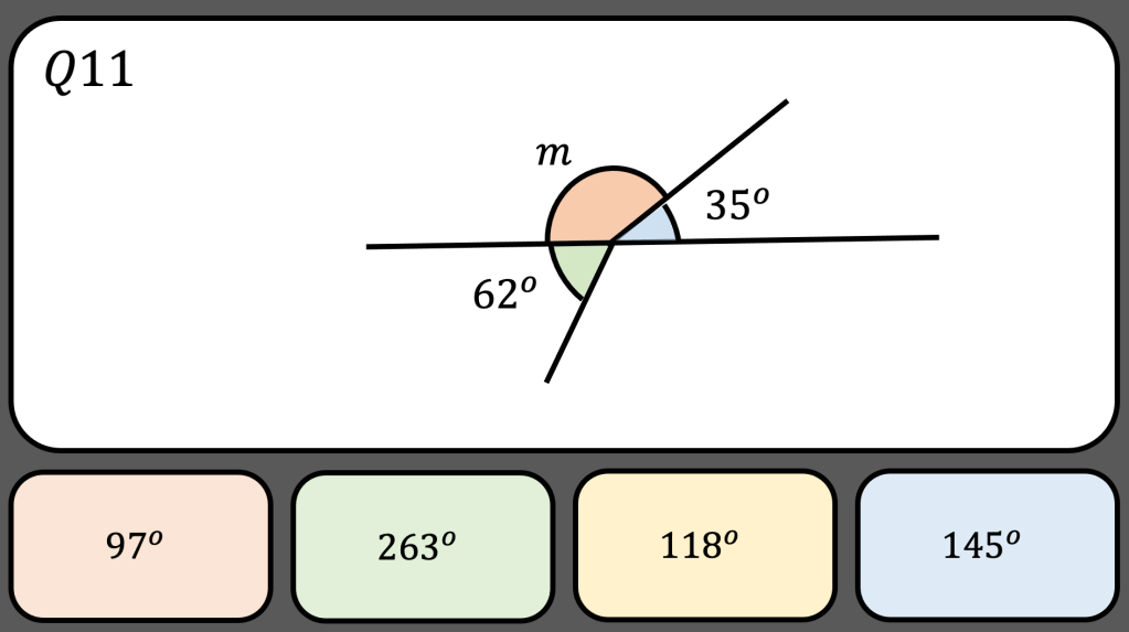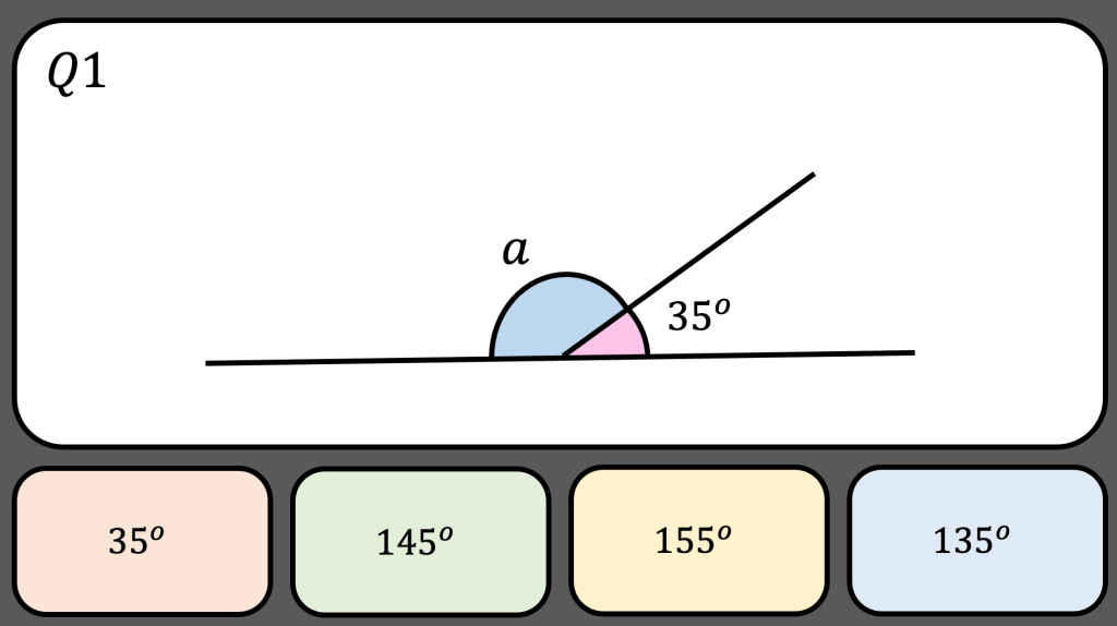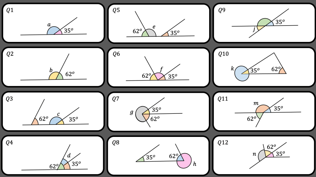 I want to make sure I don’t rush the “angles on a straight line” fact and ensure I cover questions where students have to reason as well as find missing angles. I also want to give students exposure to questions where more than one point is marked on a line and students have to find missing angles around those points.