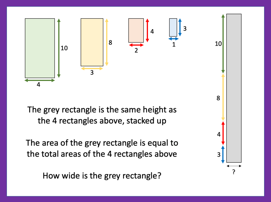 Then I want to look at the problem below and usually I would look at the approach in the middle but I am unsure if its worth looking at the blue method. I guess what is worrying me is that the class aren’t as fluent with fractions as I’d hoped so they would struggle to see the connections. I think I will teach the middle method and then see if they can understand what is happening at each stage in the other methods.
